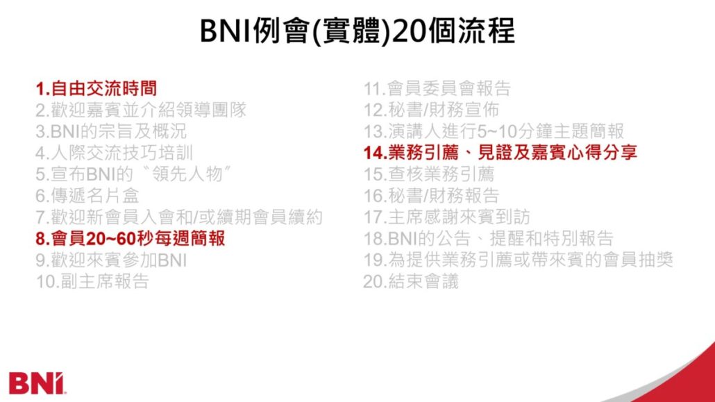 每個人都有機會向各位會員報告自己的業務,有8分鐘的時間,但是要把握以下重點