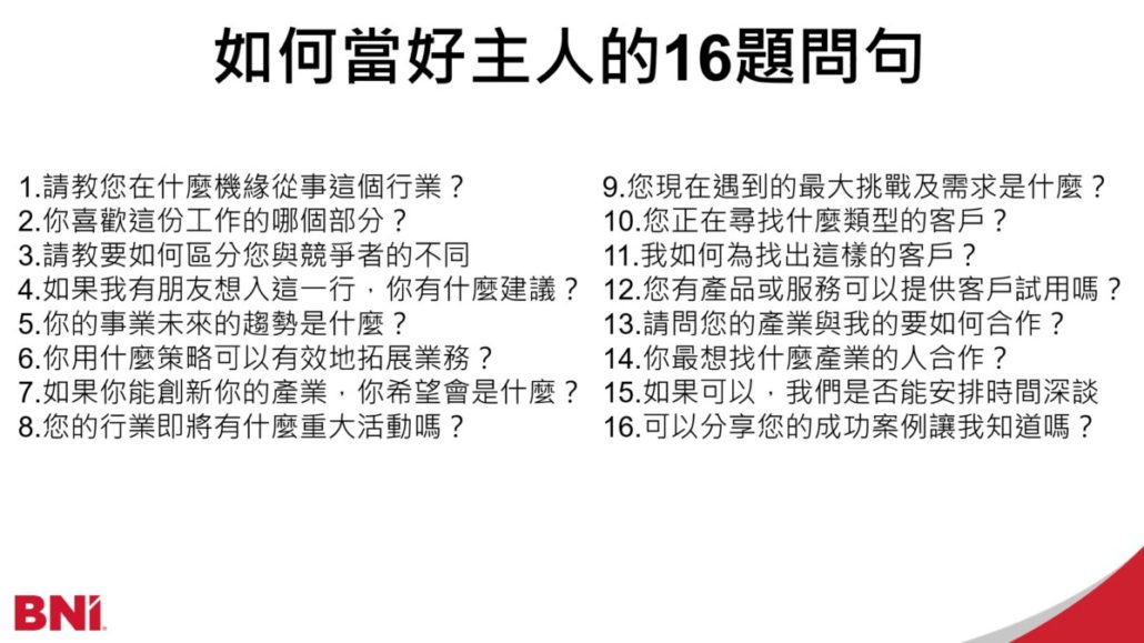 當我們在跟來賓交流時候,有時候可能會不知道要講什麼?以下有16個提問句,可以參考