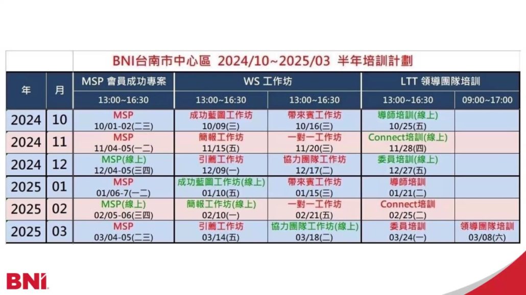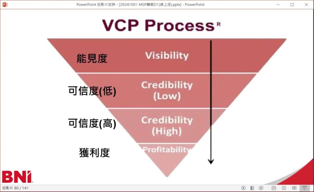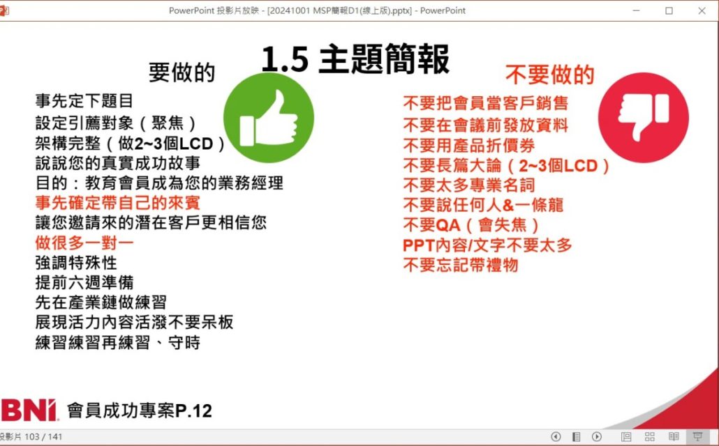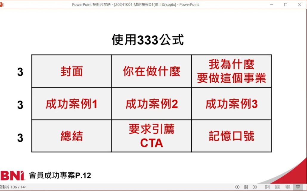 MSP(Member Success Program)是一個身為BNi會員的啟動課程,上完MSP的培訓課程,可以快速了解BNi的系統運作、系統價值包涵:一對一工作坊、30 秒自我介紹練習、邀請來賓技巧、引薦方法分享…等等。
