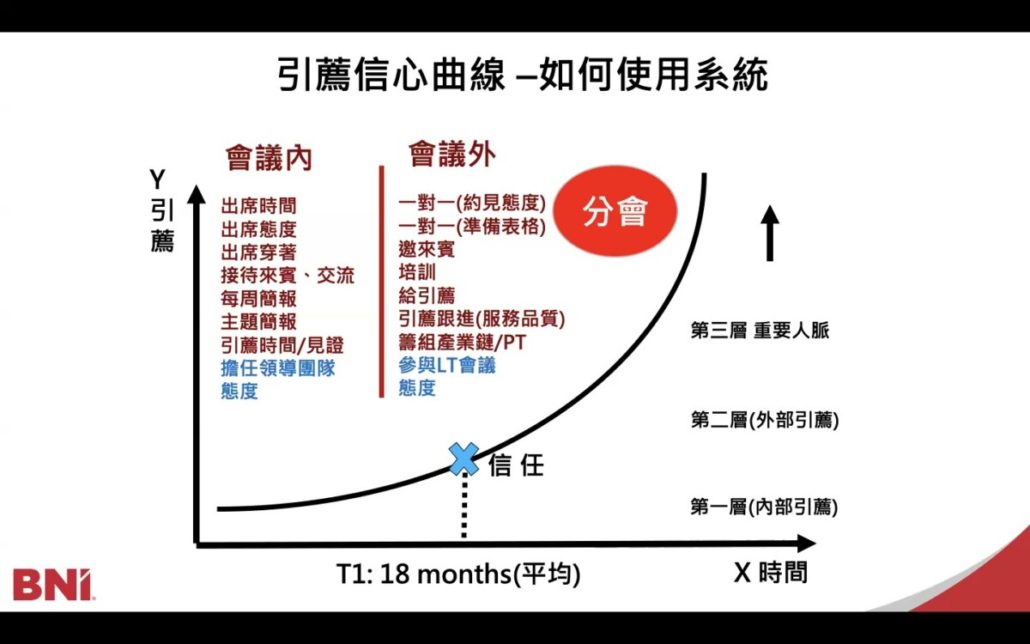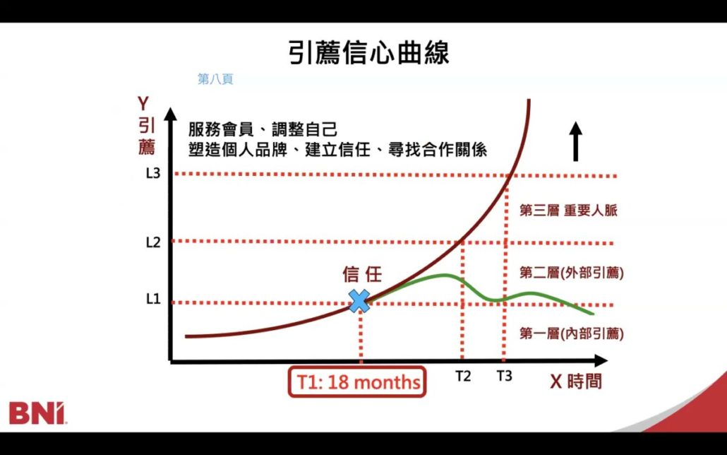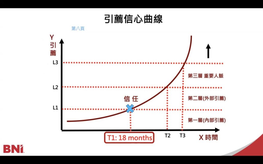 這是一張信心曲線,當我加入BNi時可能會很期待在短期間有內部引薦,以達成績效的考量,在經由講師說明後才知道信任是需要時間累積的,而這個內部引薦平均時間為18個月