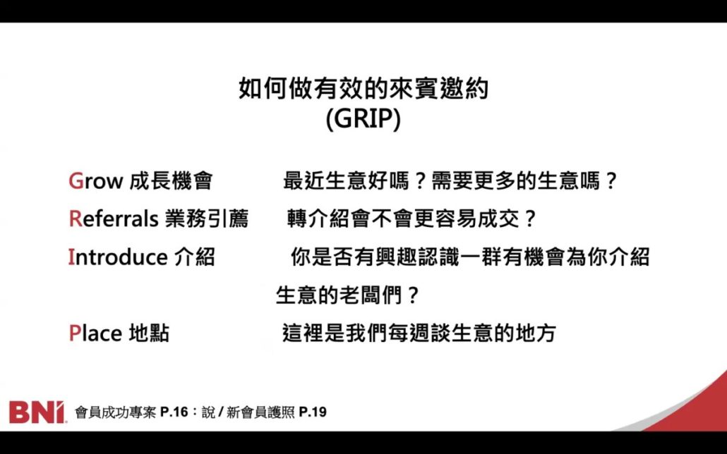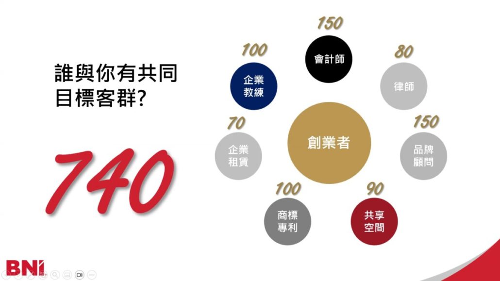 根據每個分會的大小不同,會有20-60秒的時間來說明你得業務跟其他人有哪些不同之處,並且提出請你需要的對象是哪些人?還有你的Slogan來增強你的企業識別度。