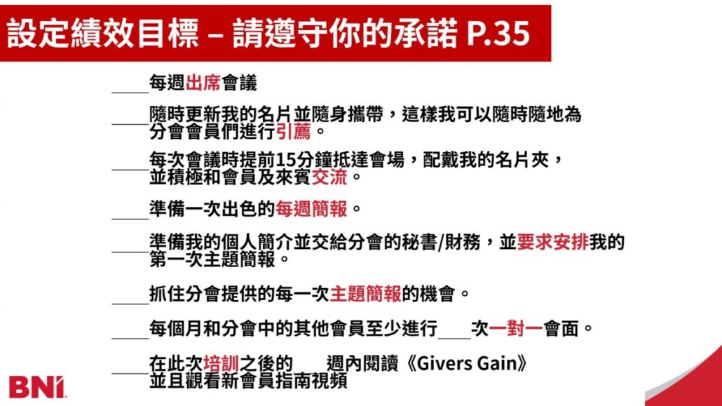 如果在會內,應該做的事情,例如:出席、一對一、給引薦、邀請來賓、培訓。這些五大基本功都不做好,那麼在『紅綠燈表』就會逐漸的變成黑燈會員,這樣其實是時間拉長,信任度降低。